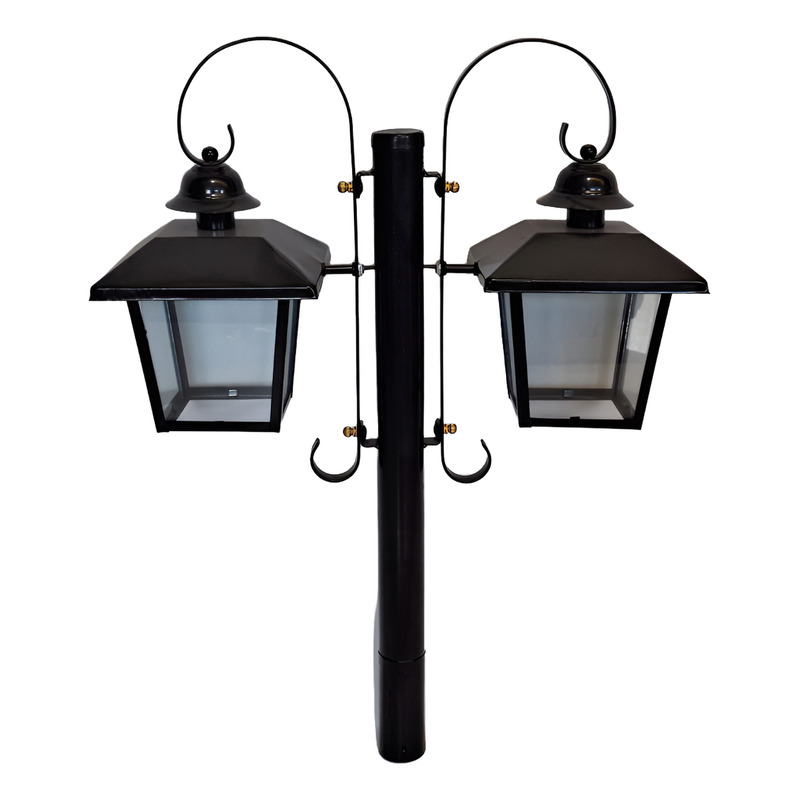 INCLUYE 2 FAROLES CUADRADOS CON TECHO DE CHAPA Y PORTALAMPARAS E27 Y CUERPO DE HIERRO PARA ENCASTRAR EN CAÑOS DE 2.5 PULGADAS . TOTALMENTE APTO INTERPERIE, VIENE PINTADO CON PINTURA EPOXY HORNEADO CON RESITENCIA A CONDICIONES DEL EXTERIOR.