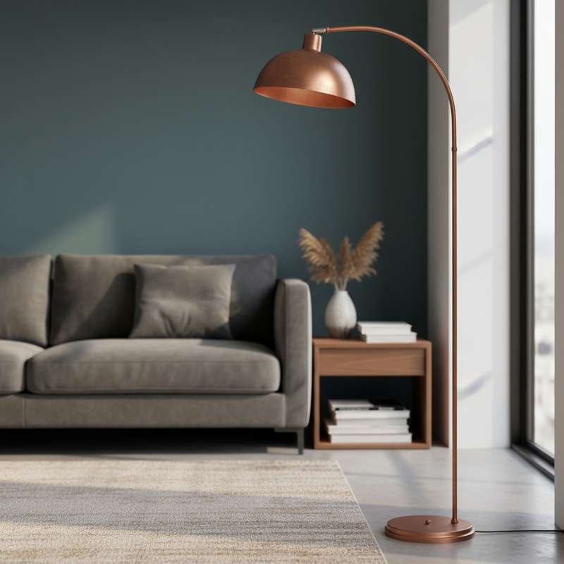 Lampara de pie con media esfera de 28 cm y movimiento en terminacion oxido.
