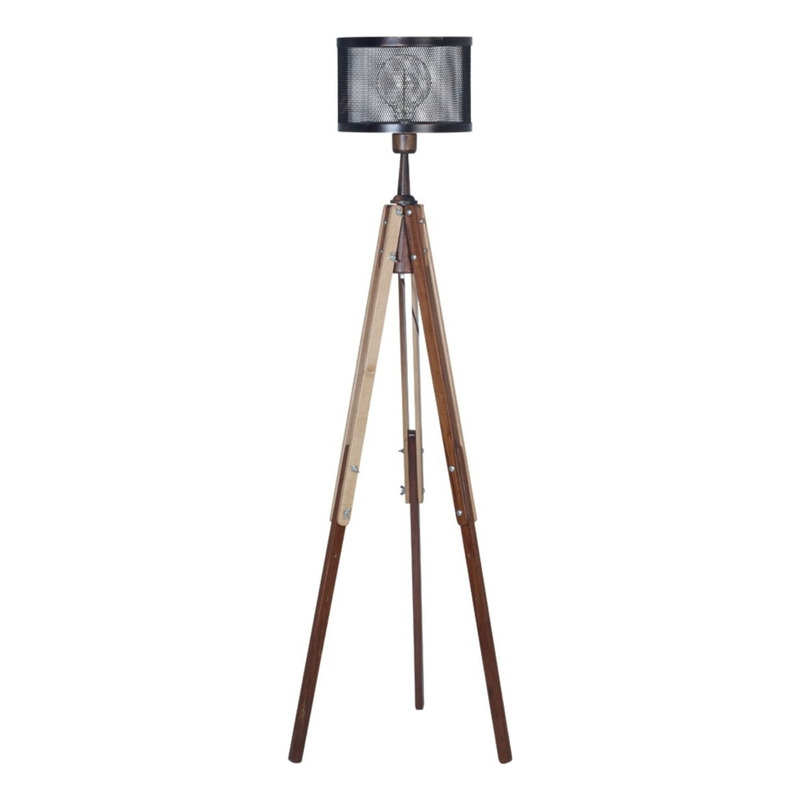Lámpara de pie trípode Hecha de Madera Guayubira Estacionada con pantalla Metalica Color Patinado Oxido. Detalles Metalicos, Madera en color claro y oscuro.